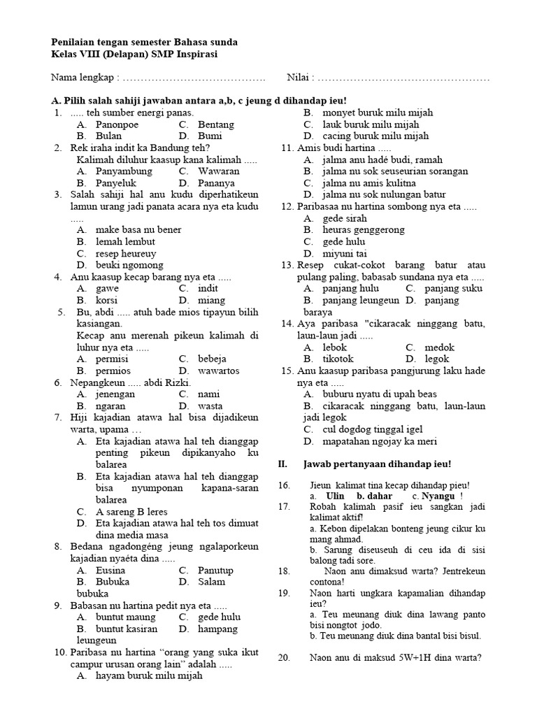 Memasuki semester kedua tahun ajaran baru seringkali diiringi dengan peningkatan intensitas pembelajaran dan evaluasi. Bagi siswa kelas 8, mata pelajaran Bahasa Sunda menjadi salah satu fokus penting yang memerlukan pemahaman mendalam. Untuk membantu para siswa dalam mempersiapkan diri menghadapi penilaian harian, tengah semester, maupun akhir semester, ketersediaan materi latihan yang relevan dan terstruktur menjadi sangat krusial. Artikel ini akan membahas secara mendalam mengenai pentingnya latihan soal Bahasa Sunda kelas 8 semester 2, serta bagaimana cara mudah untuk mengunduh kumpulan soal dalam format dokumen Word yang praktis.